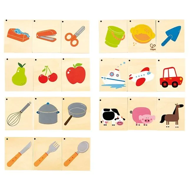 Stimuleer de taalontwikkeling van jouw kindje door alle plaatjes te laten benoemen. Voor een stapje verder in de taalontwikkeling kun je vragen tot welke categorie de 3 kaartjes horen; gereedschap, vervoer, etc.
