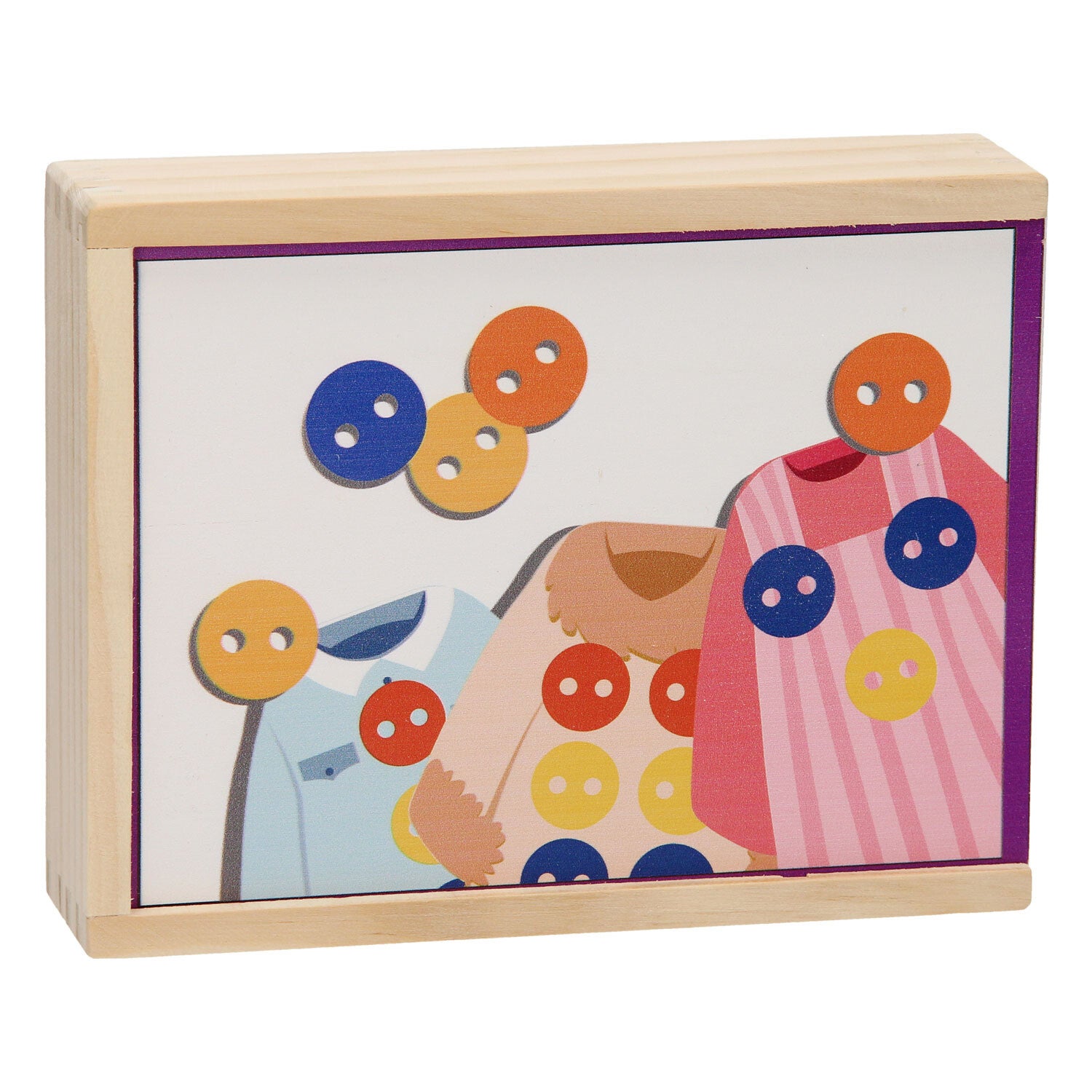 Het spel bevat 3 houten kledingstukken, verschillend gekleurde knopen en een rijgtouw.