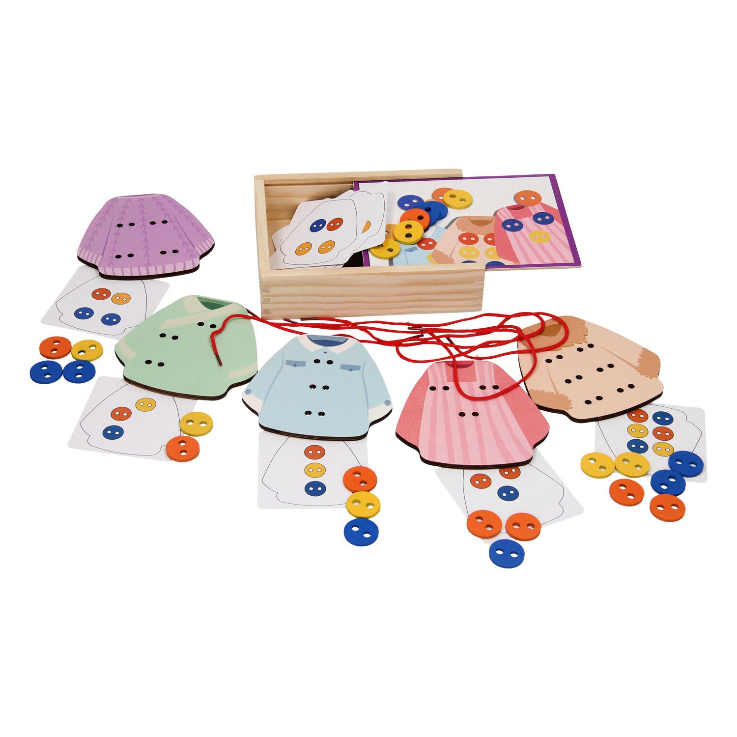 Rijg knopen op de kledingstukken met dit Knopen Rijgspel. Draai een voorbeeldkaart om en knoop het kleurenpatroon na.