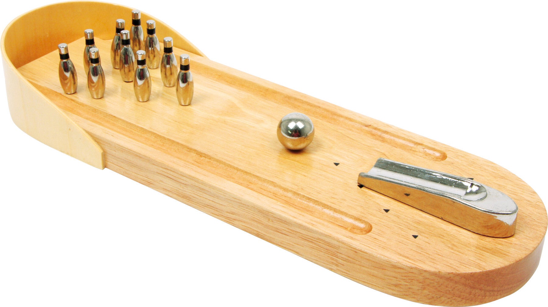 Bowlen aan je eigen keukentafel! Op de beukenhouten plank zet je de metalen kegels neer. De 'bowlingbal' leg je in het gootje en rollen maar. Gooi je een strike?