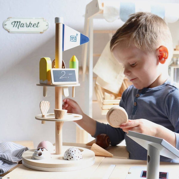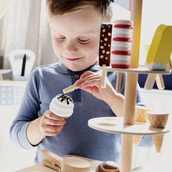Maak met deze stevige houten ijswinkel allerlei lekkere ijsjes. Zet de prijs op het prijskaartje. En met de magnetische ijsschep maak je de mooiste bolletjes op een hoorntje.