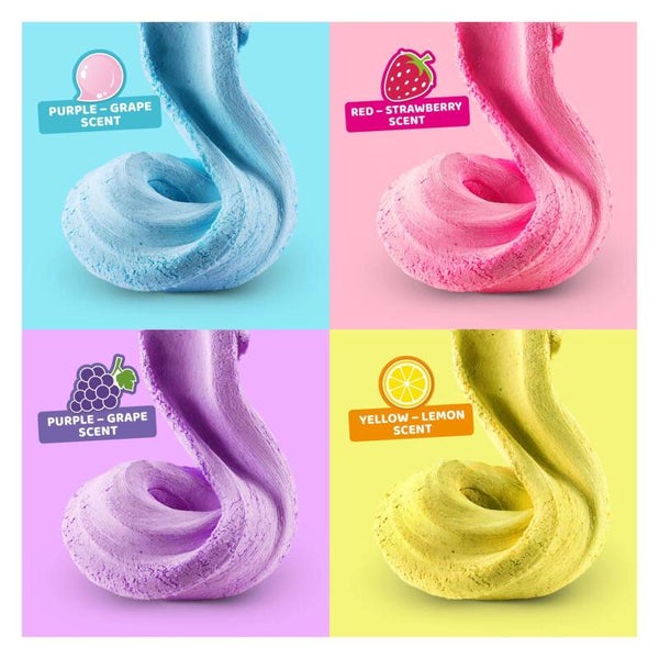 Sensorisch speelgoed ten top! Het voelt hard en zacht. Is het zand, is het klei, is het slijm? Of alledrie? En dan ruikt het ook nog eens heel lekker naar druiven, citroen of aardbei.