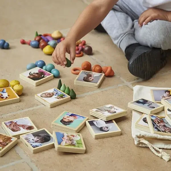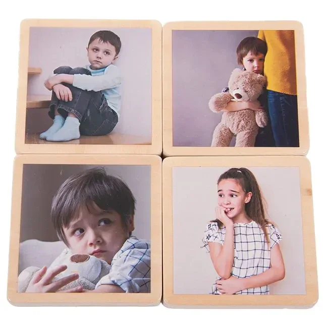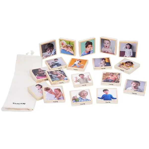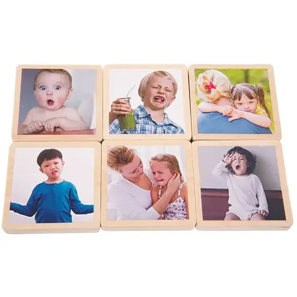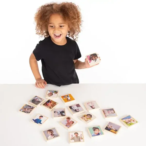Deze set bevat 18 kleurrijk bedrukte houten tegels met foto's van kinderen die een reeks emoties tonen. Deze visuele hulpmiddelen zijn perfect voor het stimuleren van empathie en begrip van menselijke emoties bij jonge kinderen.