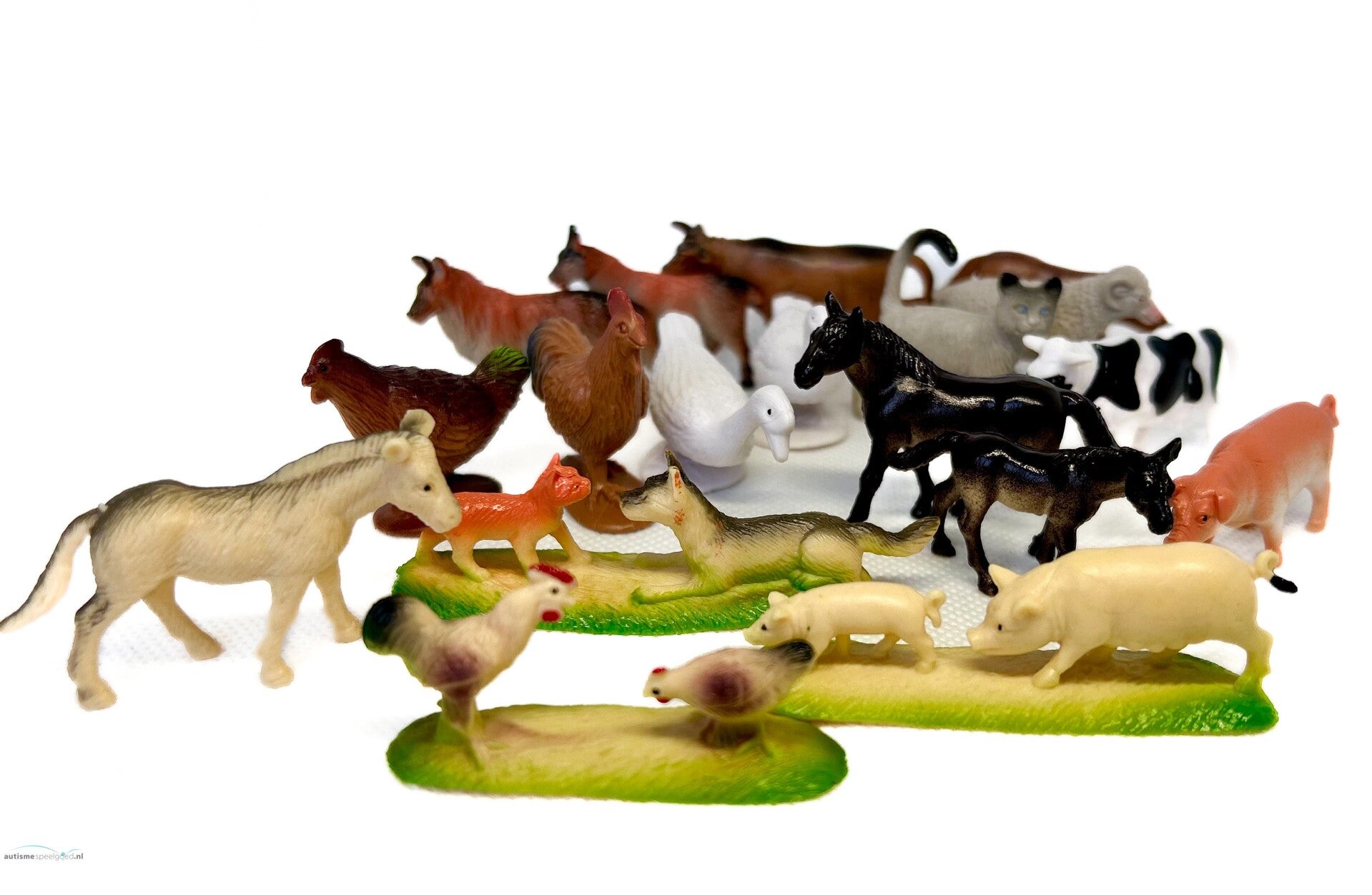 Set om matchen - zoek de zelfde - te oefenen. De set bestaat uit 18 kleineboerderij dieren en daarbij 2 x 18 gelamineerde kleuren-fotokaarten van de dieren, 18 gelamineerde tekening-kaarten, 18 schaduw kaarten en 18 gelamineerde kleuren-fotokaarten van de dieren in hun natuurlijke omgeving. Zo kun je jouw kind gelijk leren generaliseren.