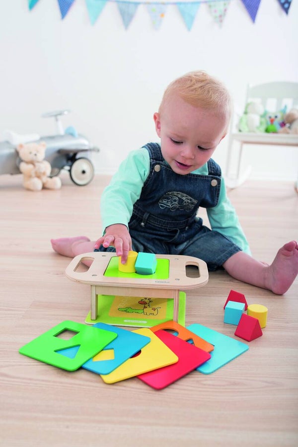 Vaak zien we dat we vormenstoven half moeten afdekken om het kindjes te kunnen aanleren. Dat probleem is opgelost bij deze vormenstoof, die stap voor stap moeilijker wordt doordat de sorteerplaten verwisselbaar zijn. Perfect om je kindje te leren focussen en hun hand-oogcoördinatie te versterken.