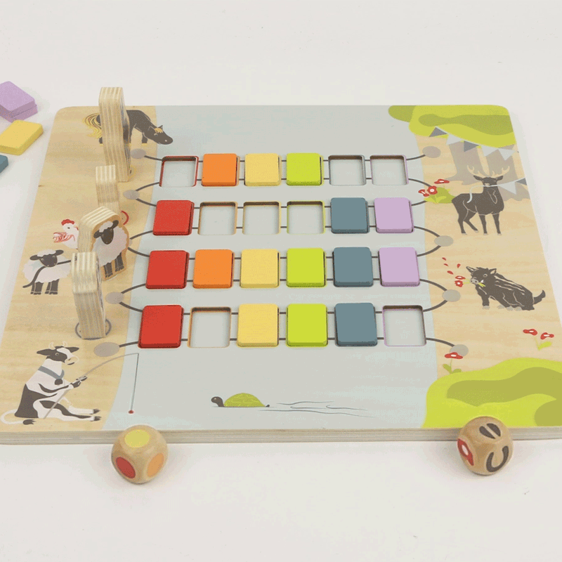Je kunt tijdens het spelen ook taal uitlokken door de kleur en het dier te laten benoemen door jouw kind, door te laten vragen om de dobbelsteen of het brugstuk. Ook conversatie kun je oefenen door vragen als ´waar gaat de koe naar toe?' en 'wie woont er op de boerderij?'.