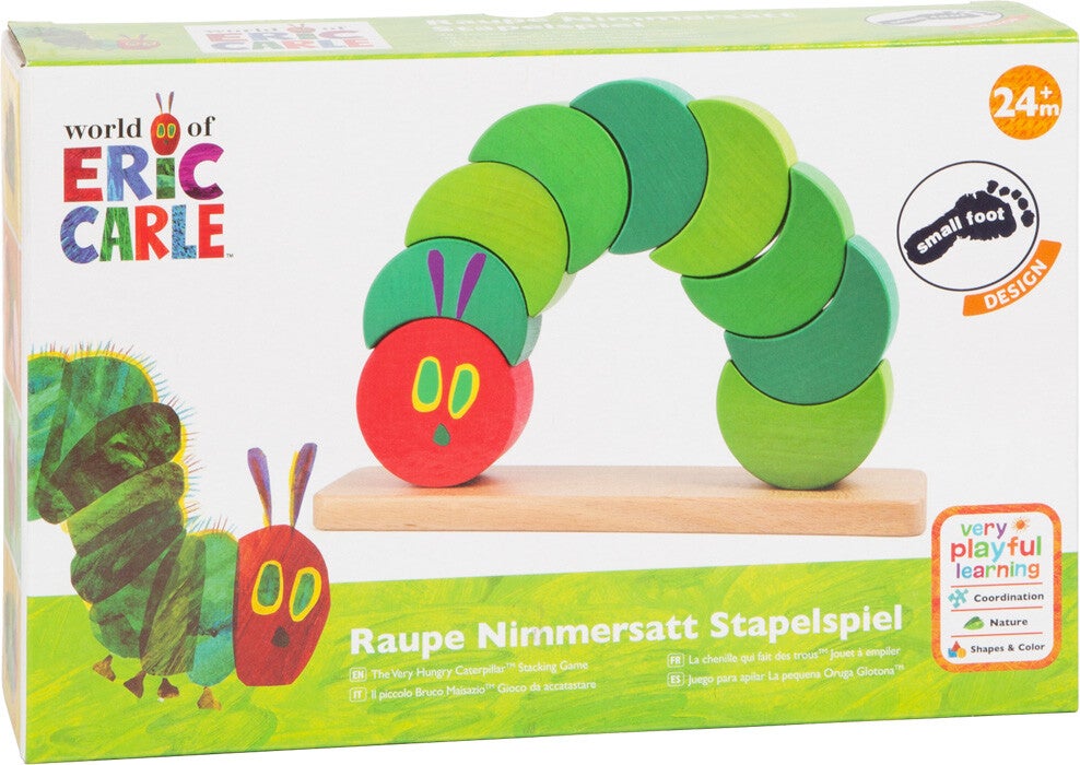 Stapel Rupsje Nooitgenoeg! Gemaakt van massief hout is hij een echte blikvanger. Wanneer de verschillende houten stukken op elkaar worden gestapeld, wordt de fijne motoriek ontwikkeld en wordt het ruimtelijk denken getraind. Een mooie uitdaging voor jonge bouwmeesters die concentratie vraagt!